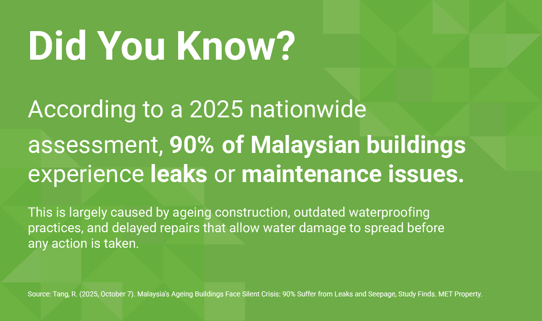 A recent industry survey involving Malaysian property and facility management professionals revealed that waterproofing-related defects are estimated to account for up to 80% of major building defects, despite waterproofing representing only 2–3% of total construction cost. This imbalance highlights how critical proper waterproofing design, installation, and maintenance truly are as highlighted by this article.